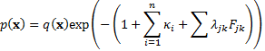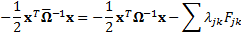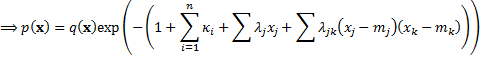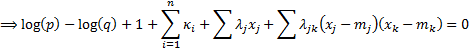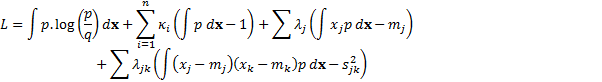 (b)   Applying analytical weighted Monte Carlo (using relative entropy) to the sort of calibration problem referred to above will therefore return (unless the calibration problem is ill-posed) a calibrated probability distribution which also has multivariate normal form. This is because the problem can be restated using Lagrange multipliers to one that involves minimising  defined as follows, where the  refer to whatever calibrations there are on the means and  to those on covariance terms (in general there will be fewer than  of the ):