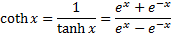 Returns the hyperbolic cotangent of an angle. This is the reciprocal of the hyperbolic tangent function: