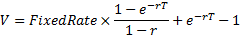 Returns the value/price now, , of a annuity of 1 times the  payable continuously for the next  years less floating rate payments for the next  years of 1 times the market floating rate, i.e.: