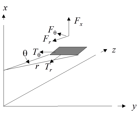 We first consider the situation where there are many stanchions suitably positioned so that each part of the mirror is subject to a force from them per unit mirror area (cross-sectional area perpendicular to the x-axis) of . We assume initially that these forces are continuously distributed, although of course in practice there would be a finite (albeit possibly quite large) number of stanchions, so we would merely have a discrete approximation to this continuous ideal. Assume that the corresponding tensions within the mirror (per unit cross-sectional area) are  in the plane of the mirror, see Figure 12.