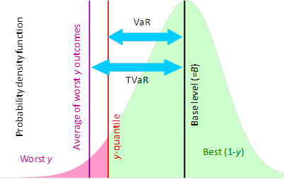 If the cubic does correspond to a valid probability distribution then the VaR and TVaR of the distribution, for a given confidence level , are defined as follows, where  is the distribution’s probability density function (assuming that we adopt the same definition for TVaR as is used in the illustrative chart below and suitably rebase the -axis, i.e. here set ):