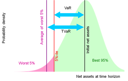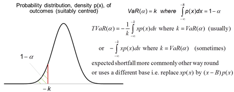 Writers use Tail VaR (TVaR) and Conditional VaR (CVaR) largely interchangeably, usually with the same loss trigger as the quantile level that would otherwise be applicable if the focus was on VaR. Occasionally, TVaR and/or CVaR are differentiated, with one being expressed in terms of the loss beyond the VaR rather than below zero. However, such a definition inherits some technical weaknesses attributable to VaR (i.e. that it no longer exhibits diversification properties we might ‘expect’ a risk measure to exhibit.